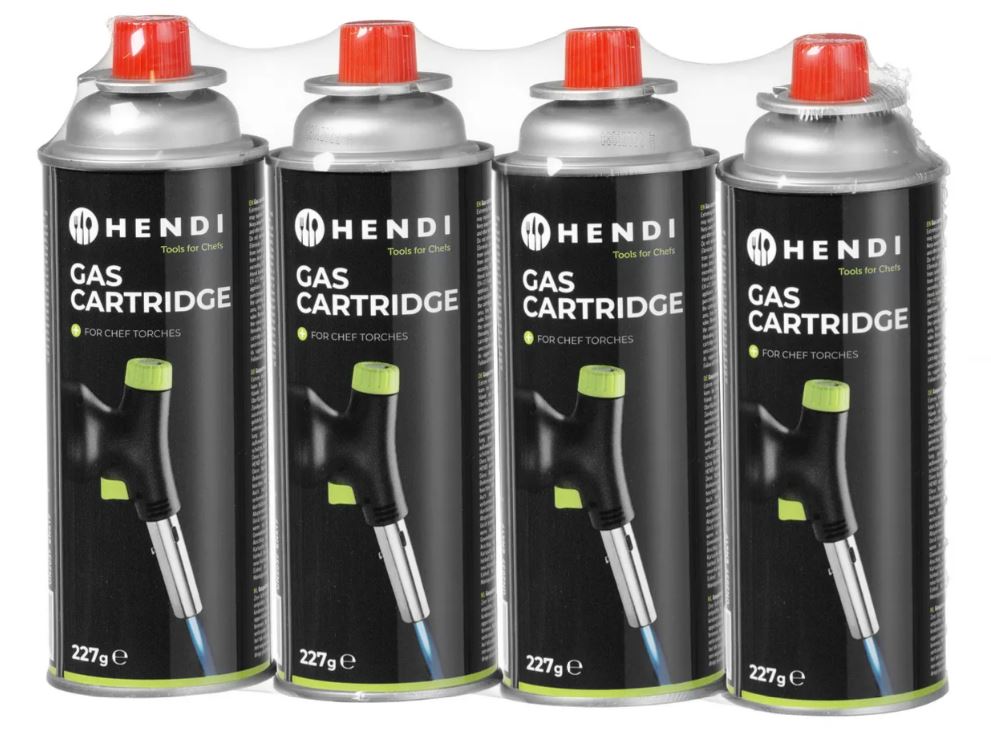 Paquet de 4 cartouches à gaz GPL, qui conviennent exclusivement pour l'utilisation avec le chalumeau de cuisine.